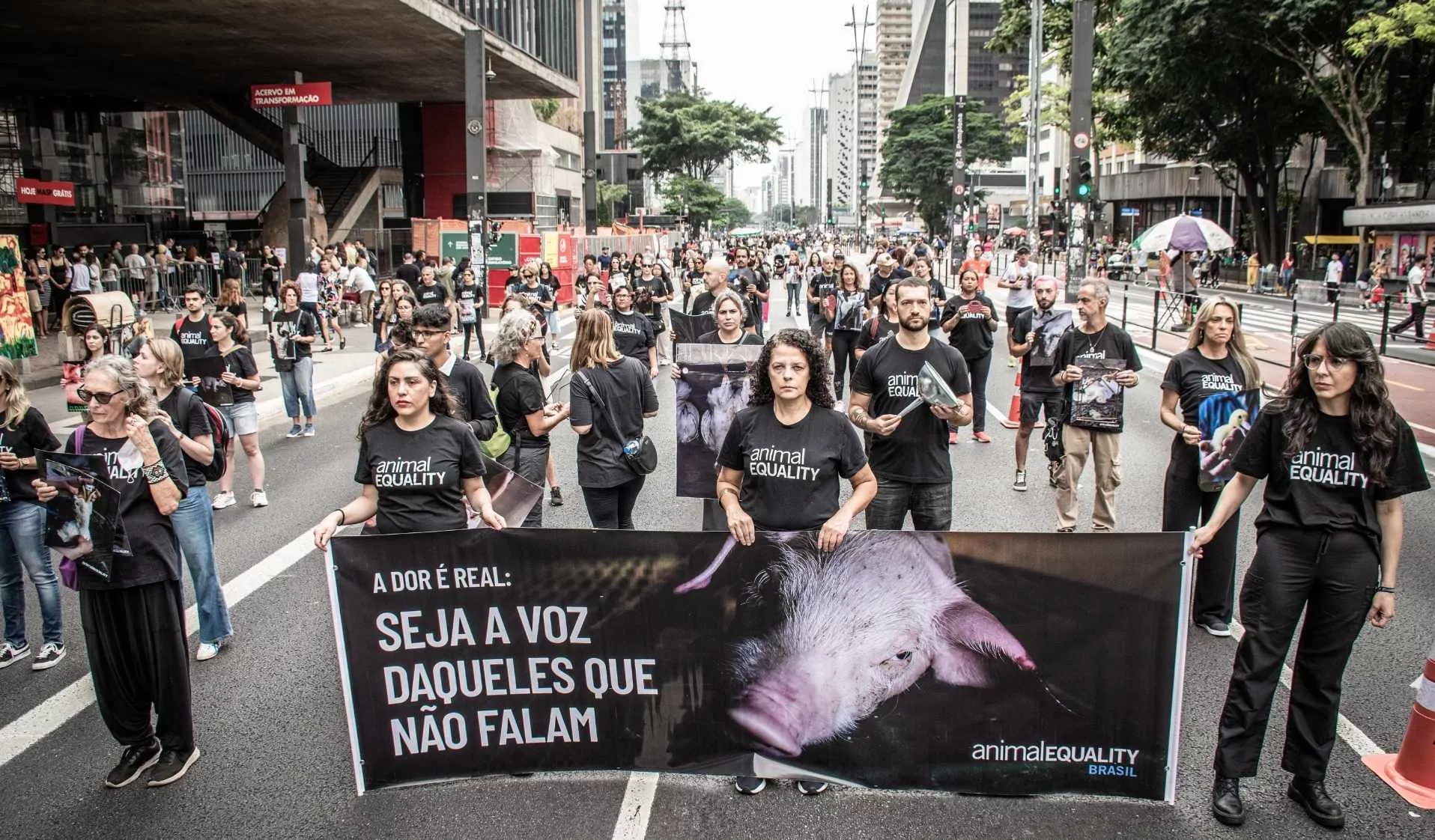 Todos os anos a Animal Equality Brasil realiza um ato na Avenida Paulista no domingo mais próximo ao Dia Internacional dos Direitos Animais.